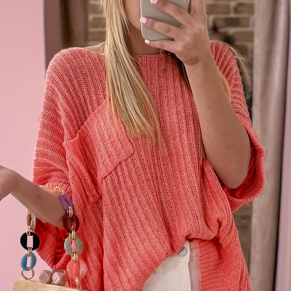 Fresh Salmon Rolled Cuffs Loose Knit Tee with Slits