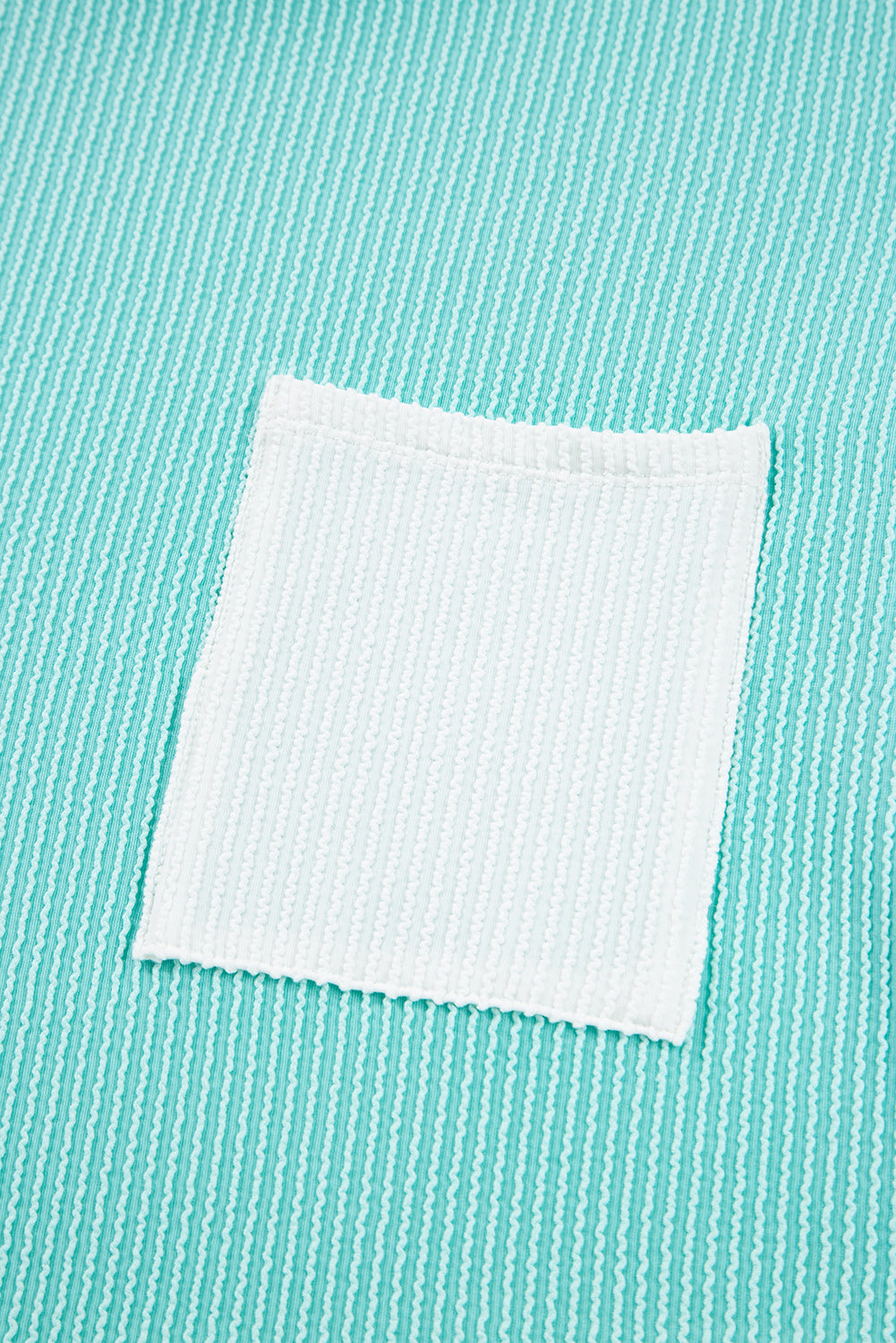Iceland Blue 3D Ribbed Texture Contrast Patched Pocket Long Sleeve Top